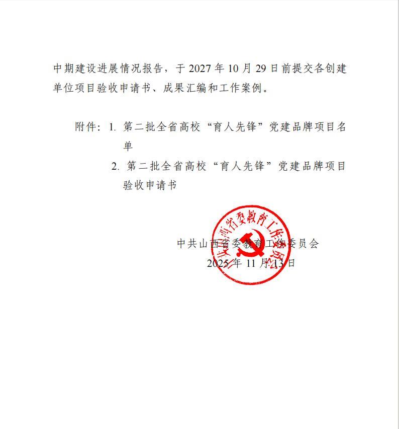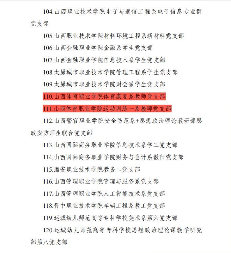 根据《中共山西省委教育工作委员会关于公布第二批全省高校“育人先锋”党建品牌项目名单的通知》(晋教工委组函〔2025〕28号),我院体育康复系教师党支部和运动训练一系教师党支部获批全省高校党建工作样板支部创建单位。