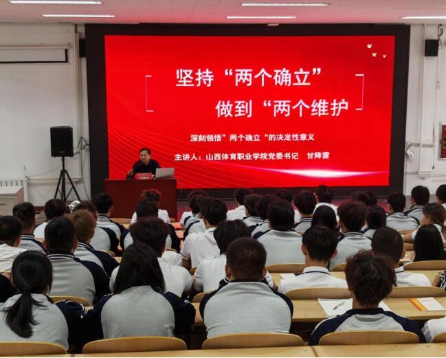为深入学习贯彻习近平新时代中国特色社会主义思想,切实落实立德树人根本任务,9月18日,我院党委书记甘降雷在阶梯教室以“坚持‘两个确立’,做到‘两个维护’——深刻领悟‘两个确立’的决定性意义”为题,为思想政治教学部全体教师和社会体育系学生讲授专题思政课。