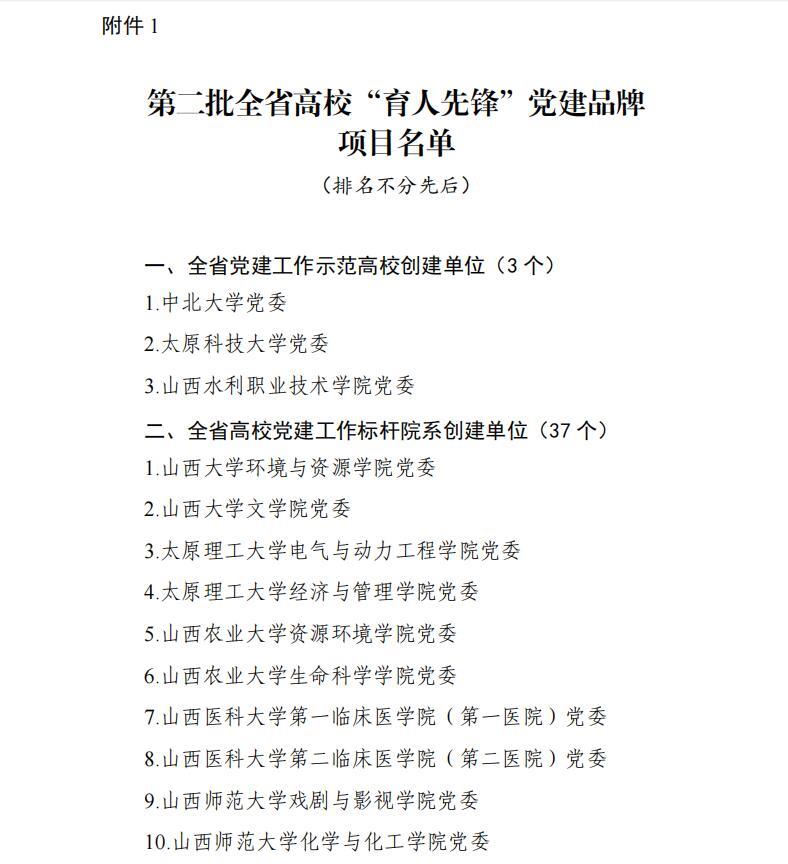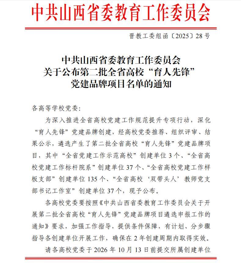 根据《中共山西省委教育工作委员会关于公布第二批全省高校“育人先锋”党建品牌项目名单的通知》(晋教工委组函〔2025〕28号),我院体育康复系教师党支部和运动训练一系教师党支部获批全省高校党建工作样板支部创建单位。