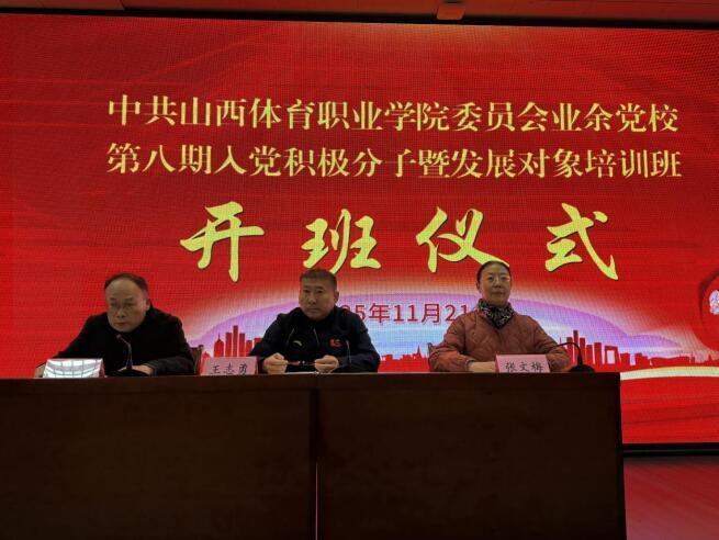 11月21日学院举行中共山西体育职业学院委员会业余党校第八期入党积极分子暨发展对象培训班。学院学院党委副书记、院长王志勇,学院党委副书记张文梅出席开班仪式;承担本次培训授课任务的专职组织员及业余党校老师和全院第八期入党积极分子和发展对象参加开班仪式。