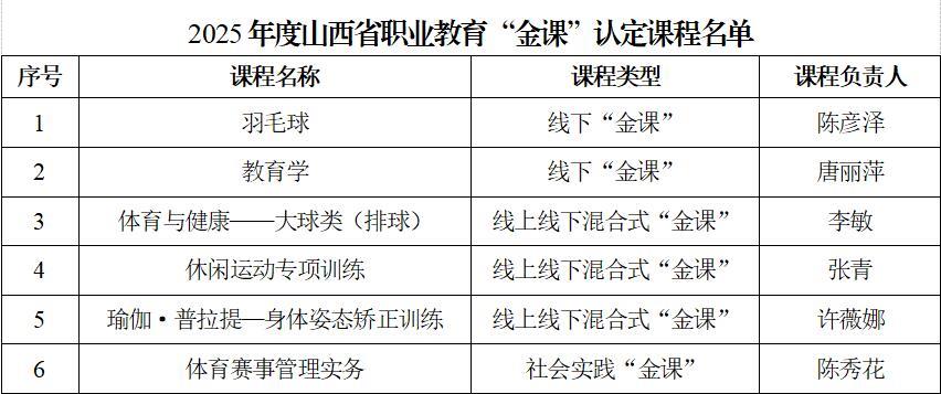 近日,山西省教育厅正式公布了2025年职业教育“金课”项目认定结果。我院6门课程获得认定,其中线下“金课”2门,线上线下混合式“金课”3门,社会实践“金课”1门。