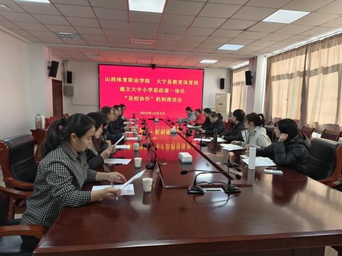 2025年12月4日,山西体育职业学院与大宁县教育体育局共同召开“建立大中小学思政课一体化‘县校协作’机制推进会”,会议由山西体育职业学院马克思主义学院副院长闫昱静主持。参加会议的有大宁县教育体育局基础教育股股长景建生、大宁县太德乡中心小学校长赵旺龙,大宁县中小学思政教师代表及山西体育职业学院马克思主义学院全体教师。双方围绕《山西体育职业学院与大宁县教育体育局建立大中小学思政课一体化“县校协作”机制的工作方案》及思政课程数字资源的建设共享等议题展开深入交流。