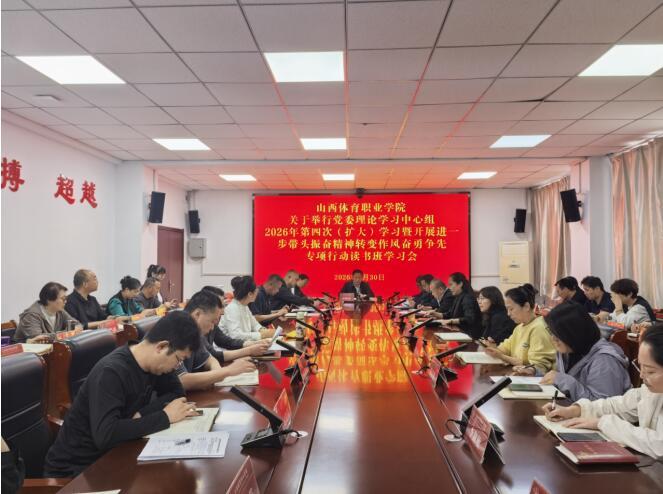 4月30日下午,山西体育职业学院召开2026年党委理论学习中心组第四次(扩大)学习会暨开展进一步带头振奋精神转变作风奋勇争先专项行动读书班。院党委委员、基层党组织书记、中层正职及部门负责人参加学习。学院党委书记甘降雷主持学习。